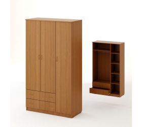 Трехстворчатый шкаф с выдвижными ящиками. Шкаф состоит из трех секций: одна оснащена полкой и штангой, вторая пятью нишами, третья двумя выдвижными ящиками. Такой шкаф идеально подойдет для размещения как одежды и белья, так и постельных принадлежностей.