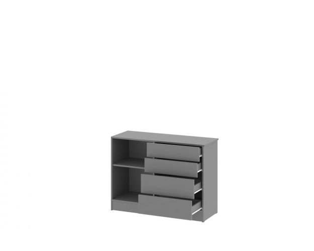 Комод шириной 1100 мм в своем конструктиве предусматривает 4 выкатных ящика разной глубины, позволяющих систематизировать хранение вещей и предметов по габаритам, и полочное пространство за распашной створкой. Открытие всех фасадный частей осуществляется боковым захватом пальцами.